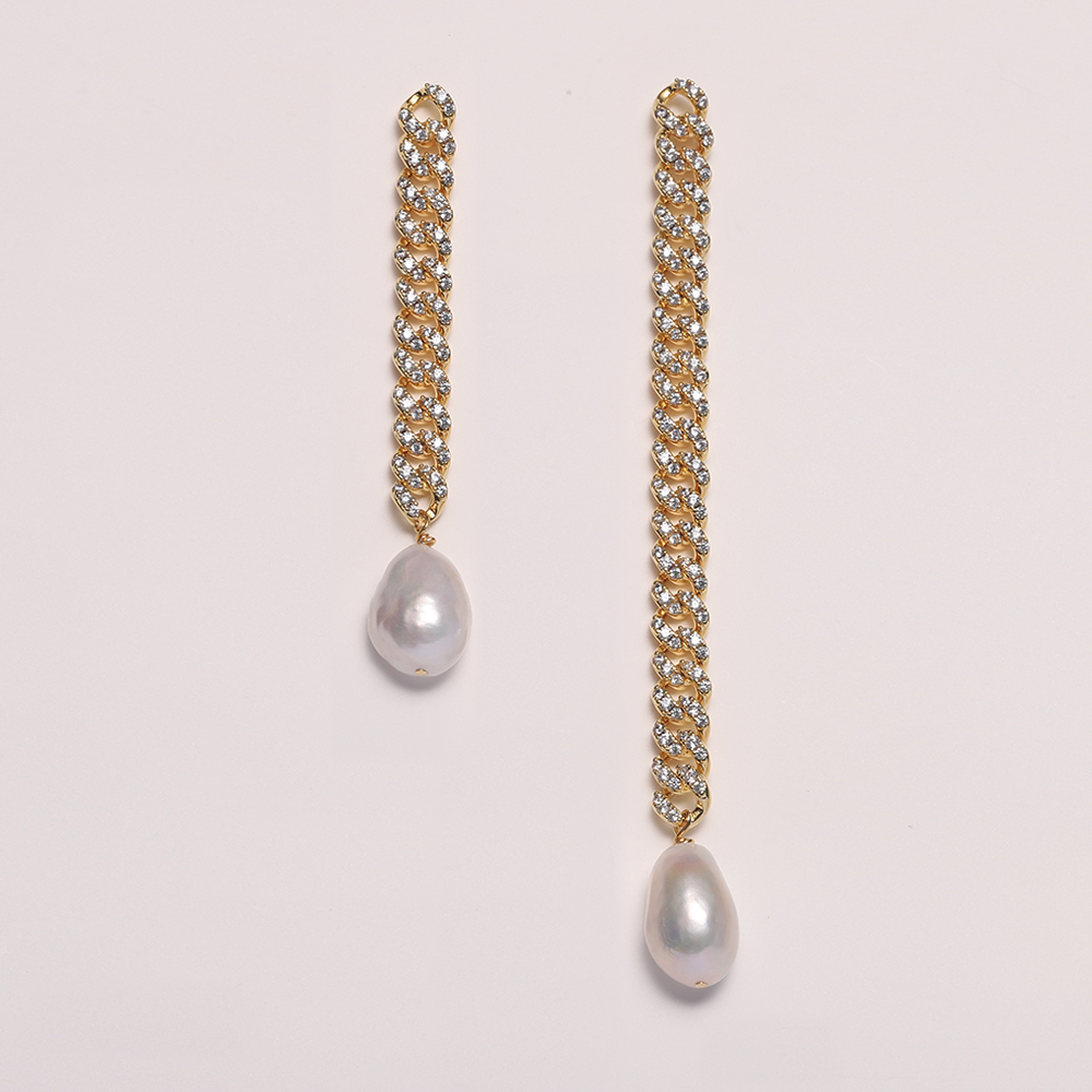 This delicate earring  is crafted in brass plated 18K yellow gold  with hand set cubic zirconium and fresh water pearl & 925 sterling silver posts.