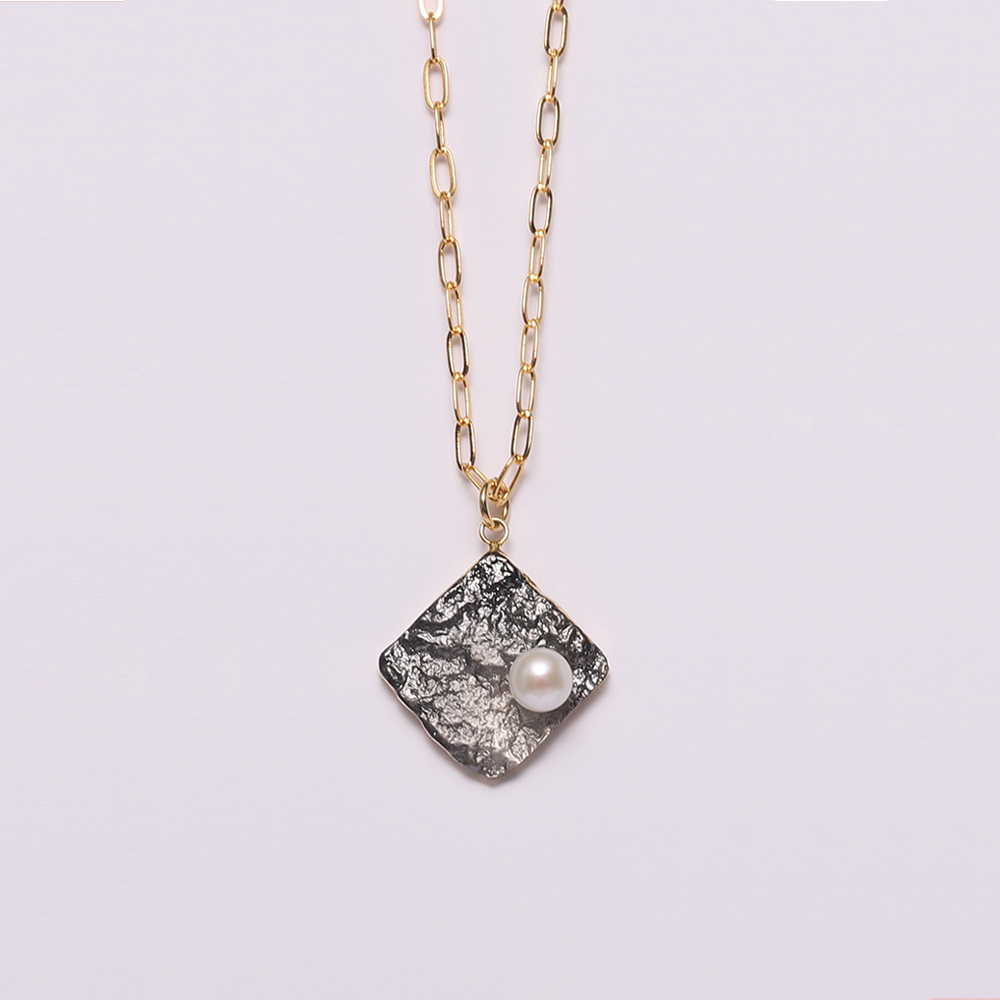 This delicate necklace is crafted in brass plated 18K yellow Gold mix black rhodium combination with fresh water pearl and hand Crafted of the Metal surface as a mercury surface effect.