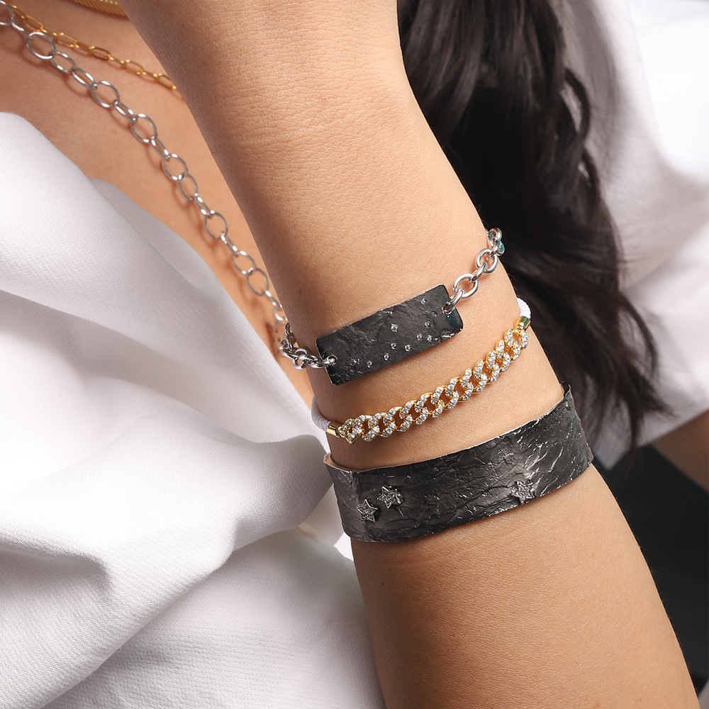 This delicate bracelet is crafted in brass plated 18K white rhodium mix black rhodium combination and hand set with shiny cubic zirconium & Fresh Water Pearl.