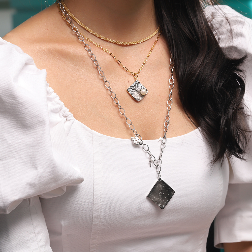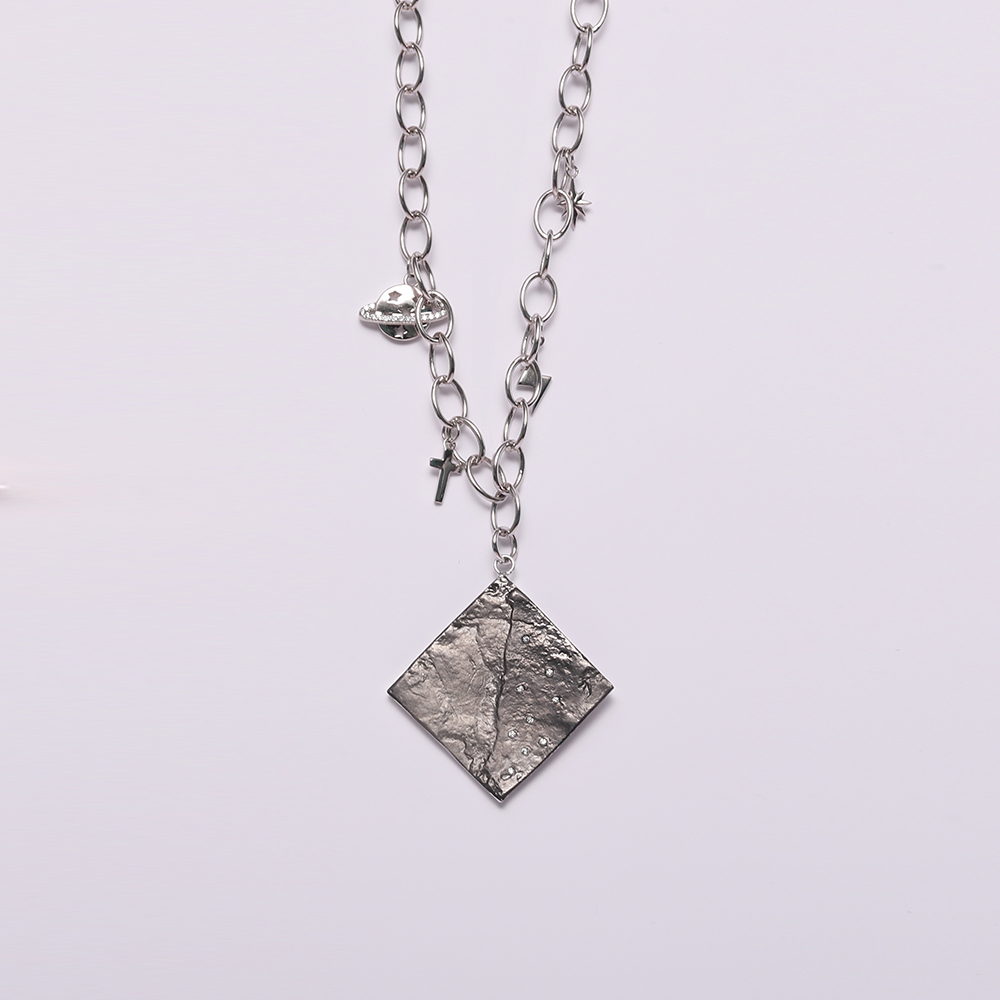 This delicate Necklace is crafted in brass plated 18K white rhodium mix black rhodium combination and hand set with shiny cubic zirconium.