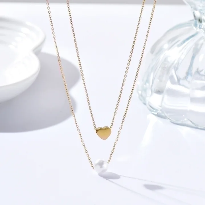 Sweet Heart Shape Stainless Steel Beaded Pearl Layered Necklaces